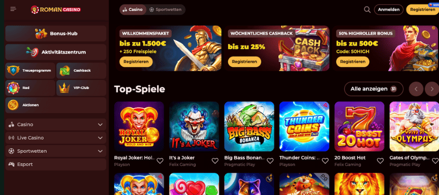 Die Spiele stammen von Marktführern wie Evolution und Pragmatic Play Live, was eine hochwertige Übertragungsqualität und professionelle Croupiers garantiert. Dank hoher Einsatzlimits und einer reaktionsschnellen Benutzeroberfläche eignet sich Roman Casino sowohl für Gelegenheitsspieler als auch für erfahrene Tischspiel-Fans.